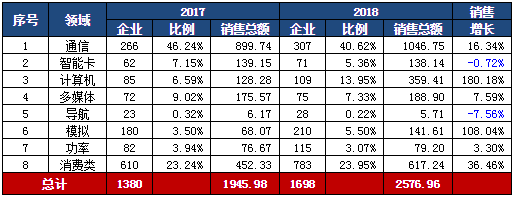 4. 产品结构继续调整。表十给出了2018年我国设计企业的主要产品领域分布。在通信、智能卡、计算机、多媒体、导航、模拟、功率和消费电子等所有8个领域,企业的数量都在增加。从事通信芯片设计的企业从2017年的266家增加到307家,对应的销售总和提升了16.34%,达到1046.75亿元;智能卡企业从上年的62家增加到71家,但销售总和下降了0.72%,为138.14亿元;从事计算机芯片设计的企业数量从去年的85家增加到109家,销售大幅提升了180.18%,达到359.41亿元;从事多媒体的企业从去年的72家略有提升至75家,销售总和提升了7.59个百分点,为188.90亿元;从事导航芯片研发的企业数量从23家增加到28家,销售总和反而下降了7.56%,为5.71亿元;模拟电路的企业数量从180家增加到210家,销售大幅提升了108.04%,达到141.61亿元;从事功率器件业务的企业从82家增加到115家,销售总和提升了3.3%,为79.2亿元;消费类电子的企业数量从上年的610家增加到783家,销售增长36.46%,达617.24亿元,继续保持了2017年的快速增长势头。